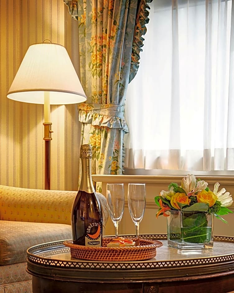 This uniquely decorated suite features a separate living room with a sofa bed and a sitting area. A flat-screen cable TV, a work desk and an private bathroom are also provided. The room is located at the back of the building.